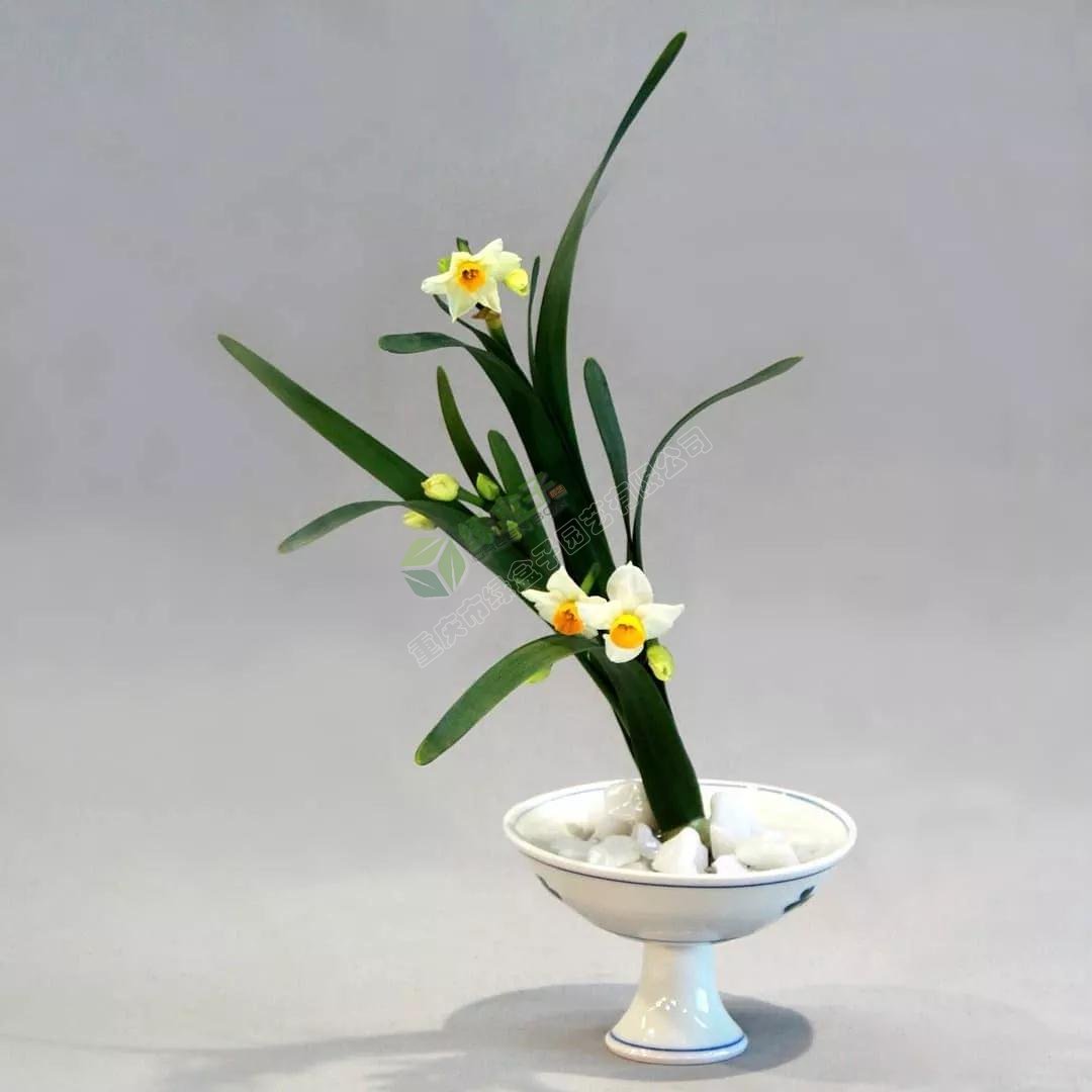 植入水仙球,盛清水、鵝卵石固定之。